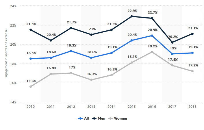 This diagram shows the average percentage of US. population engaged in sports and exercise per day from 2010-2018. This graph indicates that around 20%, so nearly every fifth person is doing sports daily. This part of the population should also be interested in Nutrition and eating healthy. This shows the potential of the company in Social media, because nearly every fifth person could possibly be interested in a restaurant like that and especially the age group from 18-24, which is really present in social media, could become potential and regularly costumers of my company.